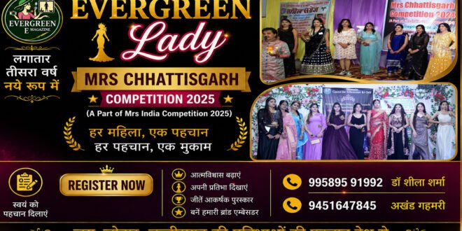 🌟 एवरग्रीन मिसेज छत्तीसगढ़ 2026 📅 दिनांक: 14 जून 2026📍 स्थान: बिलासपुर, छत्तीसगढ़ 🎯 प्रतिभागियों के लिए विस्तृत जानकारी 🔸 प्रथम चक्र (Introduction Round) प्रतिभागियों को छत्तीसगढ़ के पारंपरिक या उससे प्रेरित परिधान में मंच पर आना होगा। पारंपरिक अभिनय की झलक के साथ दर्शकों का स्वागत करें। अपना नाम और स्थान स्पष्ट रूप से बताना होगा। 🔸 द्वितीय चक्र …